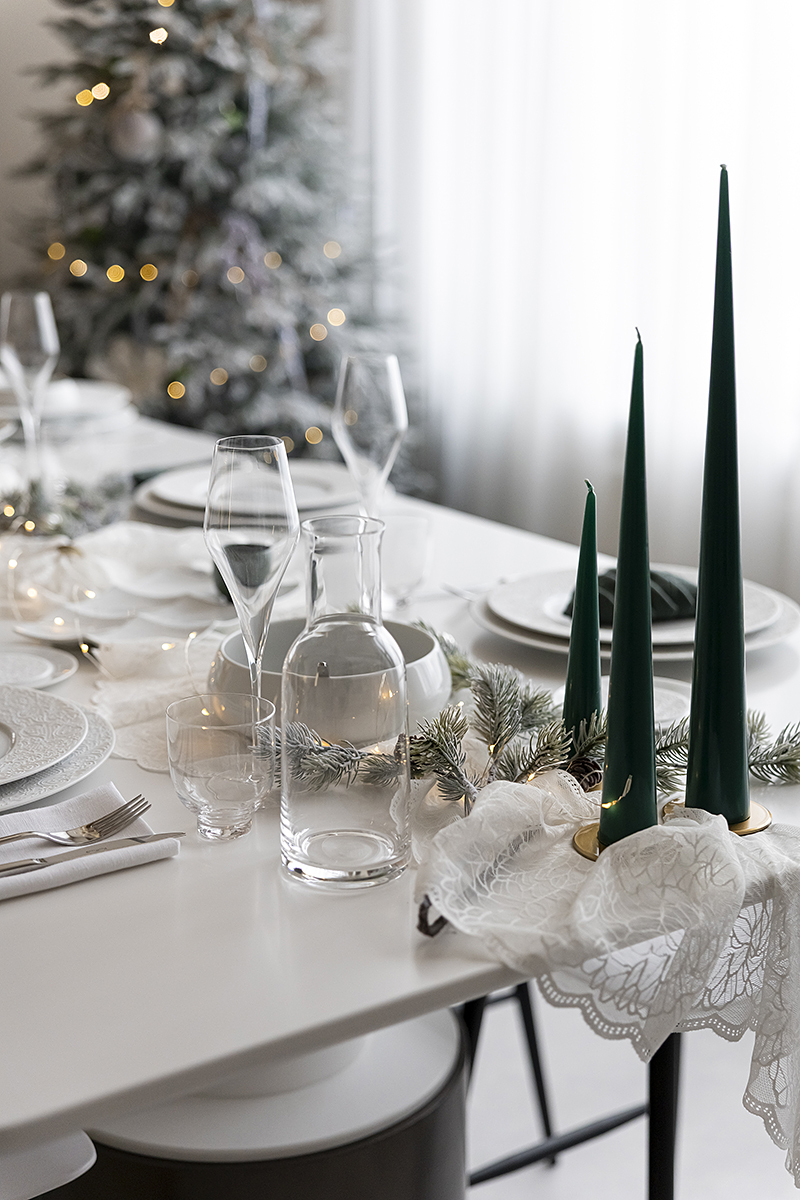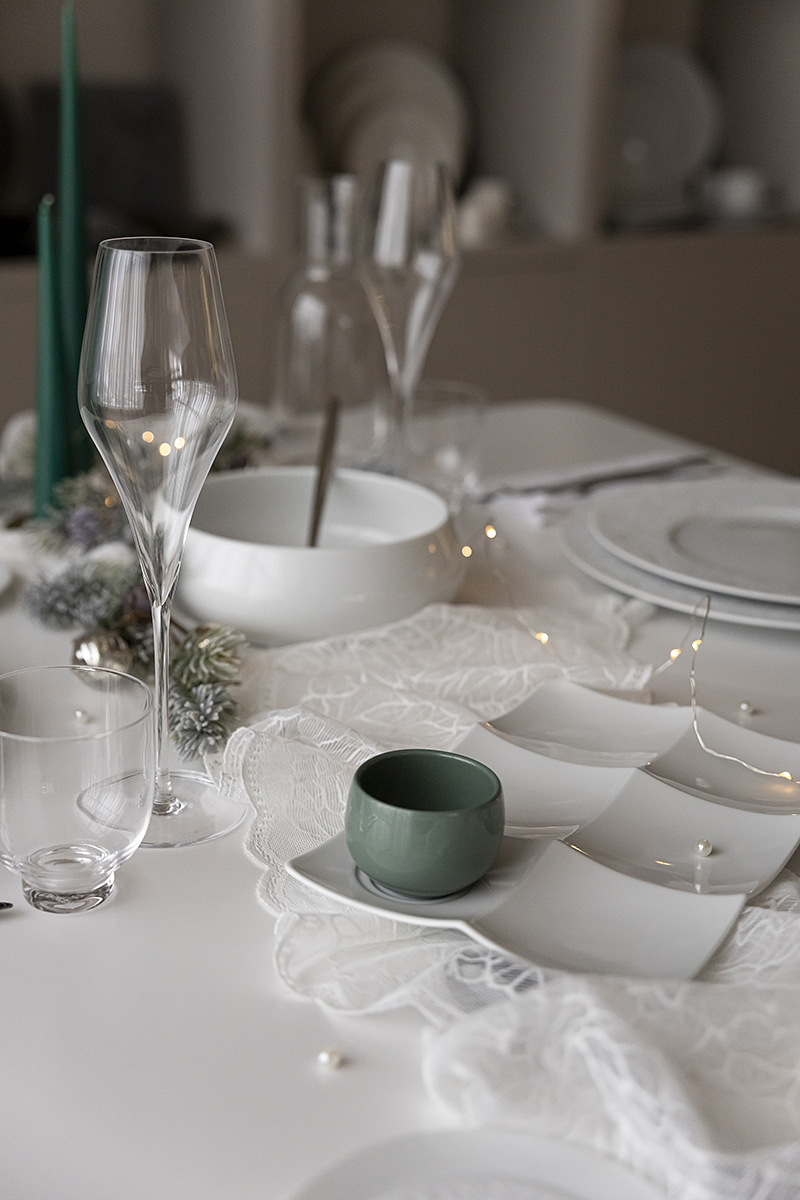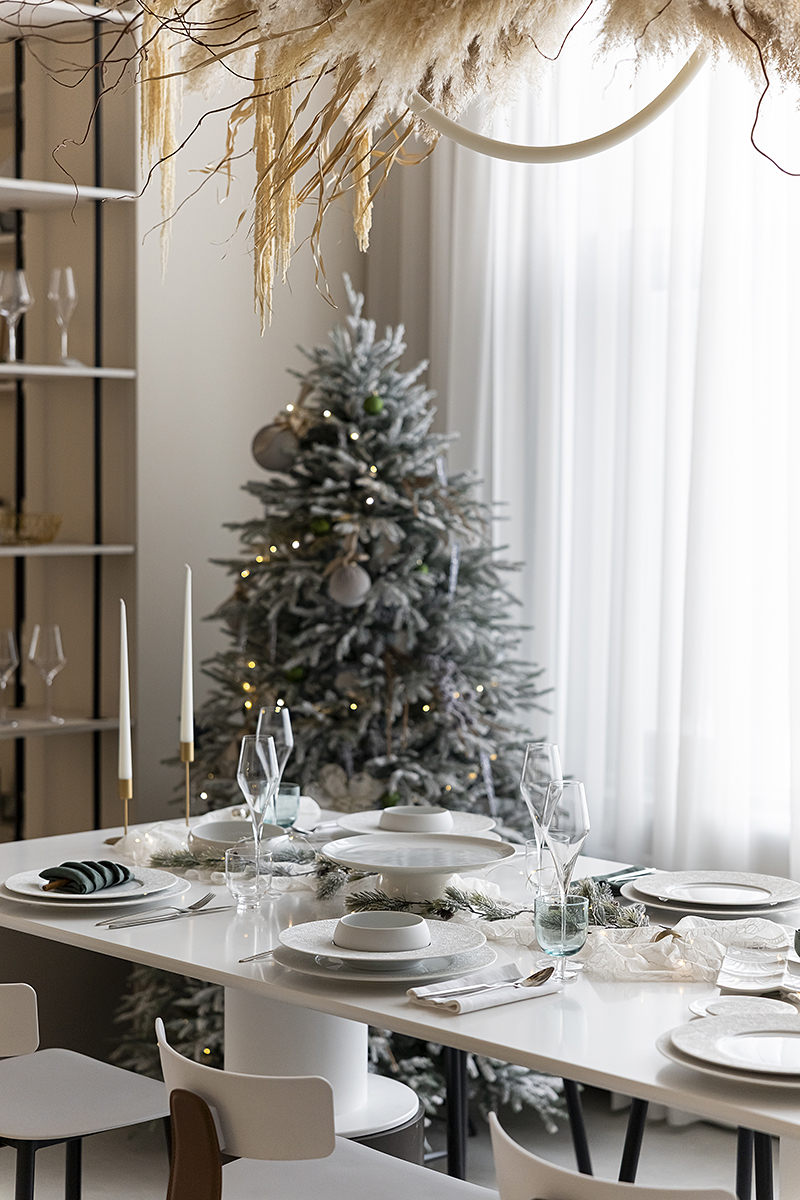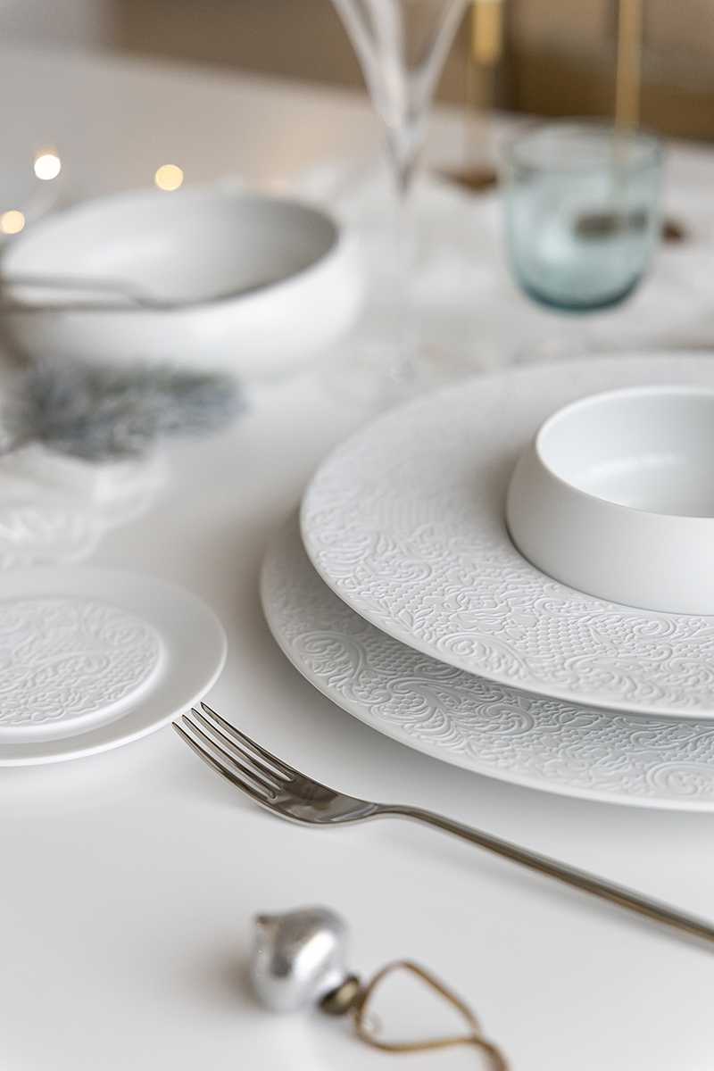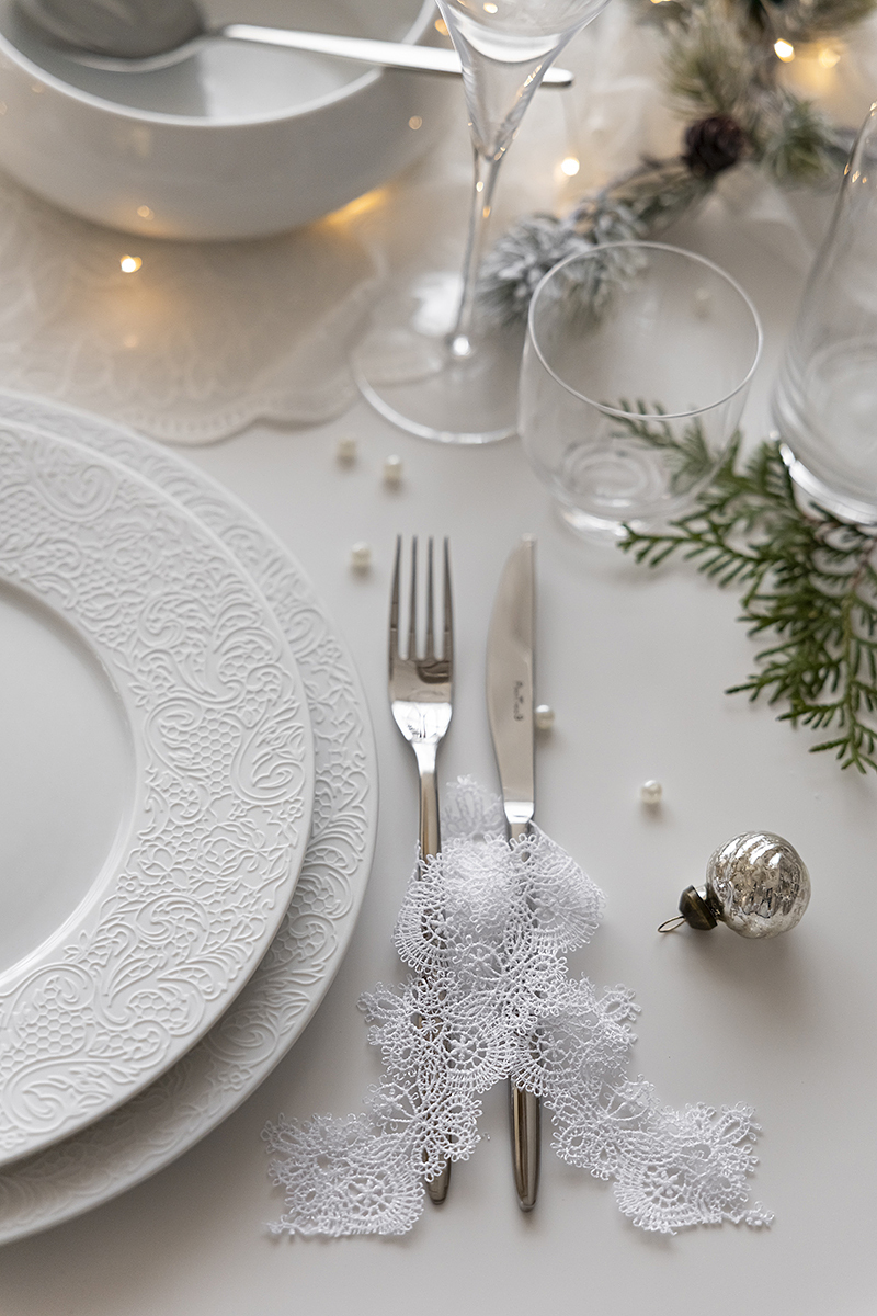Сегодня мы взяли коллекцию Couture и поддержали её резной узор настоящим кружевом. Добавили мягкий свет гирлянды, жемчуг, вплели хвою. И в итоге получился стол с ощущением тех самых узоров, которые мороз рисует на стекле❄️